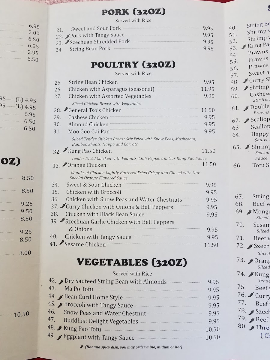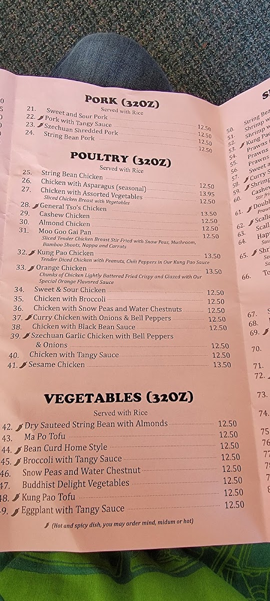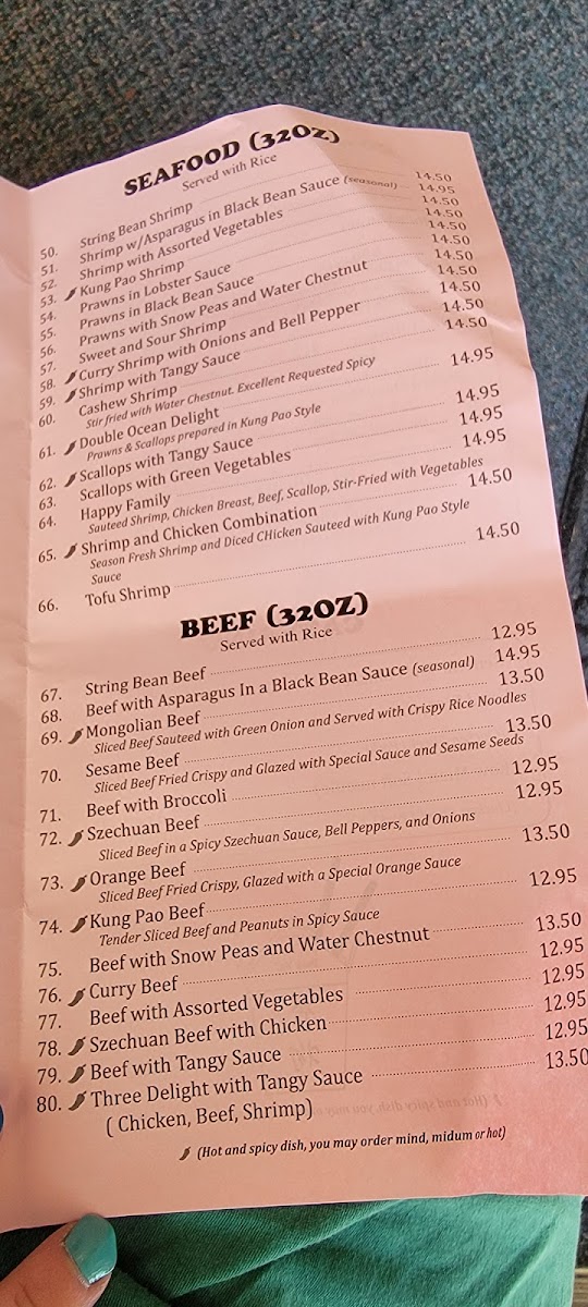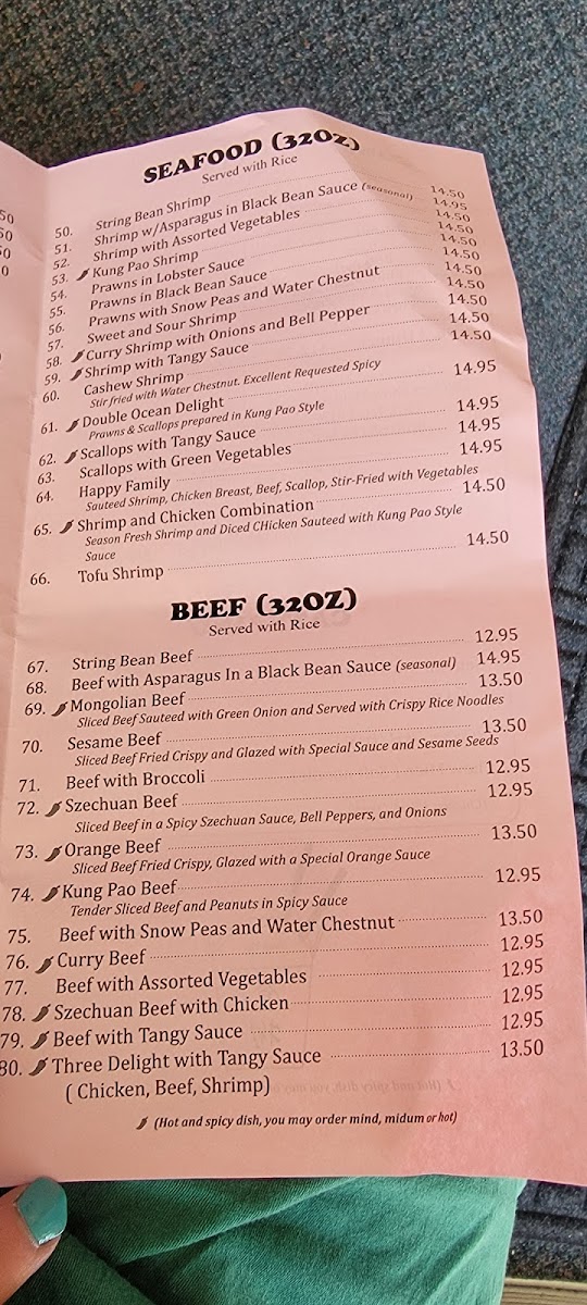 The menu is a delightful journey through flavors, showcasing a variety of noodle and rice options that will tantalize your taste buds. Try the Seafood Chow Mein, featuring soft, perfectly cooked noodles adorned with a generous medley of seafood, all for just $8.95. For something heartier, the Shrimp Fried Rice is a must-try at $7.95, packed with plump shrimp and vibrant vegetables that create a symphony of texture and taste.